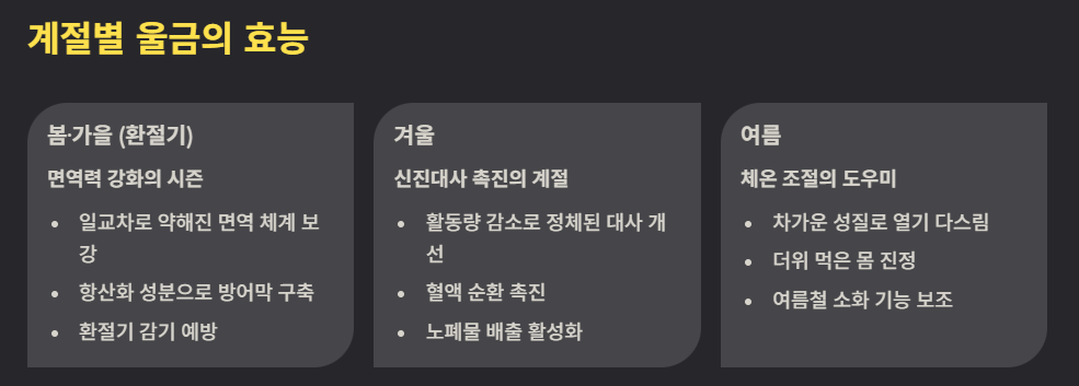 울금은 사계절 내내 좋지만, 특히 '환절기와 겨울'에 그 진가를 발휘합니다. 일교차가 커지면 우리 몸의 면역력이 떨어지기 쉬운데, 이때 울금의 항산화 성분이 몸의 방어막을 튼튼하게 세워줍니다.