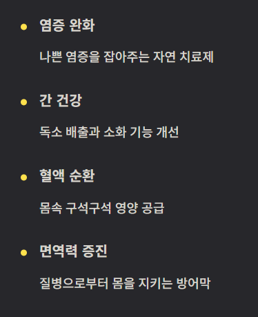 - 효능: 강력한 항염 작용과 간 해독, 혈액 순환 개선 및 면역력 강화에 탁월합니다.